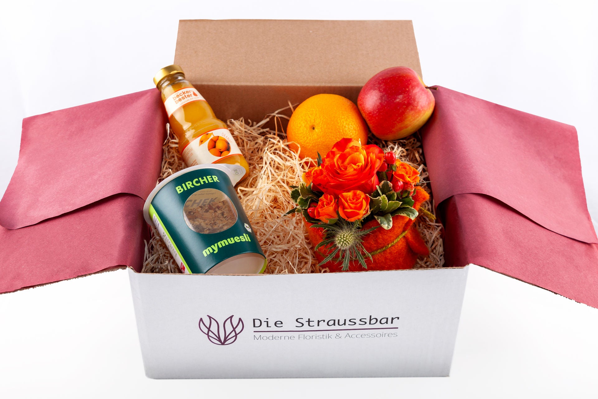 Goodbye Müdigkeit, hallo perfekter Morgen! Die Start in den Tag Box ist die ideale Überraschung für Frühaufsteher und Morgenmuffel. Mit einem leckeren Müslibecher, frischem Obst und Orangensaft startet der Tag voller Energie. Abgerundet wird das Ganze mit einem handgefertigten Blumentörtchen, das garantiert jedem ein Lächeln ins Gesicht zaubert – perfekt für alle, die ihren Morgen voller Schwung beginnen möchten.