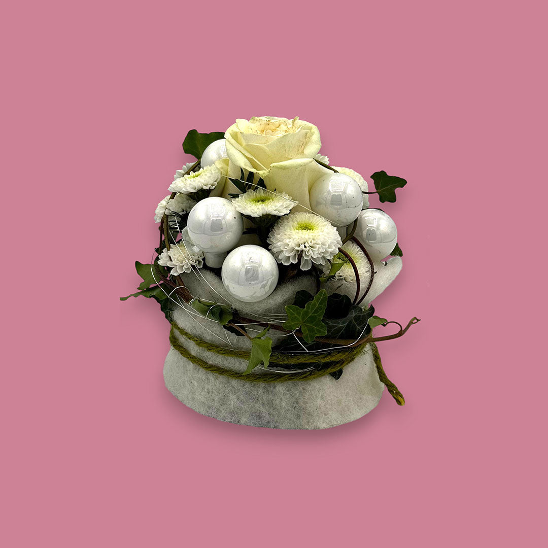 Die Straussbox "Wintertraum" enthält einen frischen Sekt, einen samtweichen Badeschwamm, eine Gesichtsmaske von Baehr Kosmetik, ein Badesalz sowie ein Teelicht. Abgerundet mit einem frisch hergestellten Blumentörtchen.